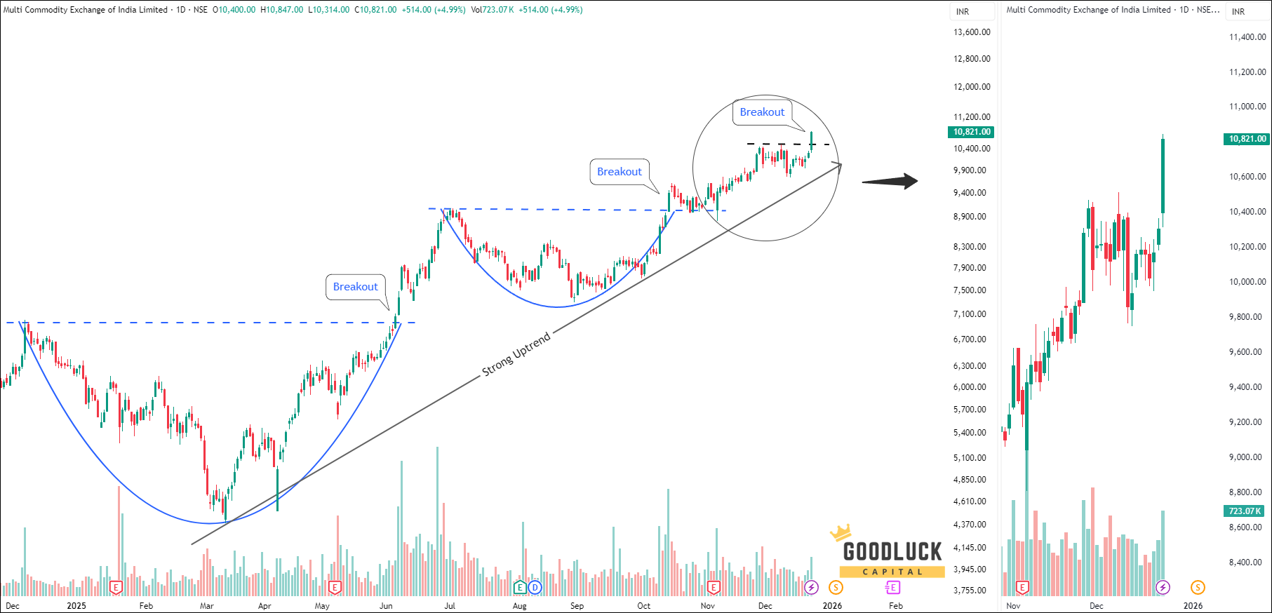 Based on our Swing stock trading advice in India, the Multi Commodity Exchange of India Stock Price target will be INR 11000 - INR 11200 in the next 12-14 trading sessions.